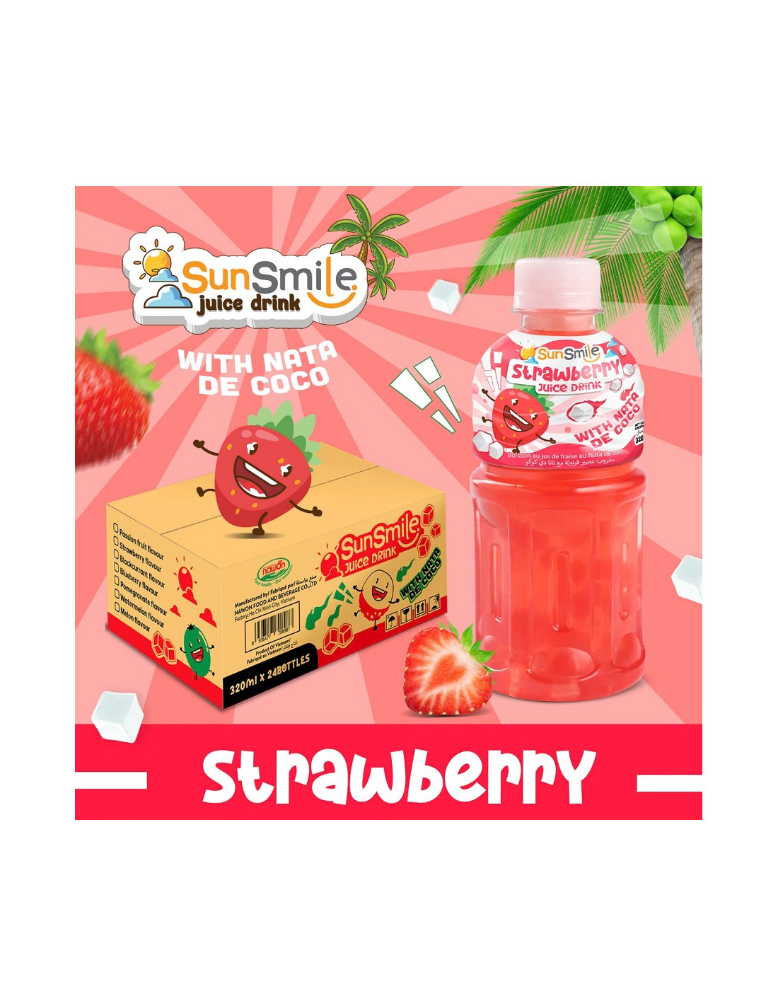 Ingredientes: agua, zumo de fresas (30%), nata de coco (15%), azúcar (8.4%), acidulante (ácido cítrico), sabor de fresa, estabilizadores, antioxidante (ácido ascórbico), conservante (sorbato de potasio), colorantes: Rojo Allura AC, E-129. Puede tener efectos negativos sobre la actividad y atencion de los niños.