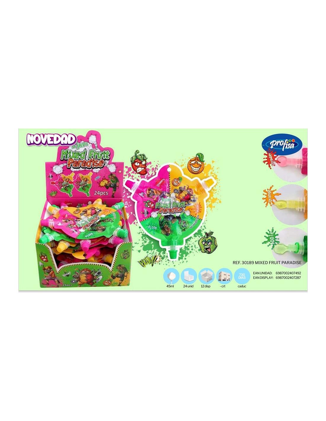 Ingredientes: agua potable, azúcar, glucosa, jarabe de glucosa, concentrado de jugo de manzana, regulador de acidez: E330, E331, conservante: E202, saborizante artificial, colorantes: E102, E110, E129, E133. Los colorantes E110, E102 y E129 podrían afectar negativamente la actividad y la atención de los niños.